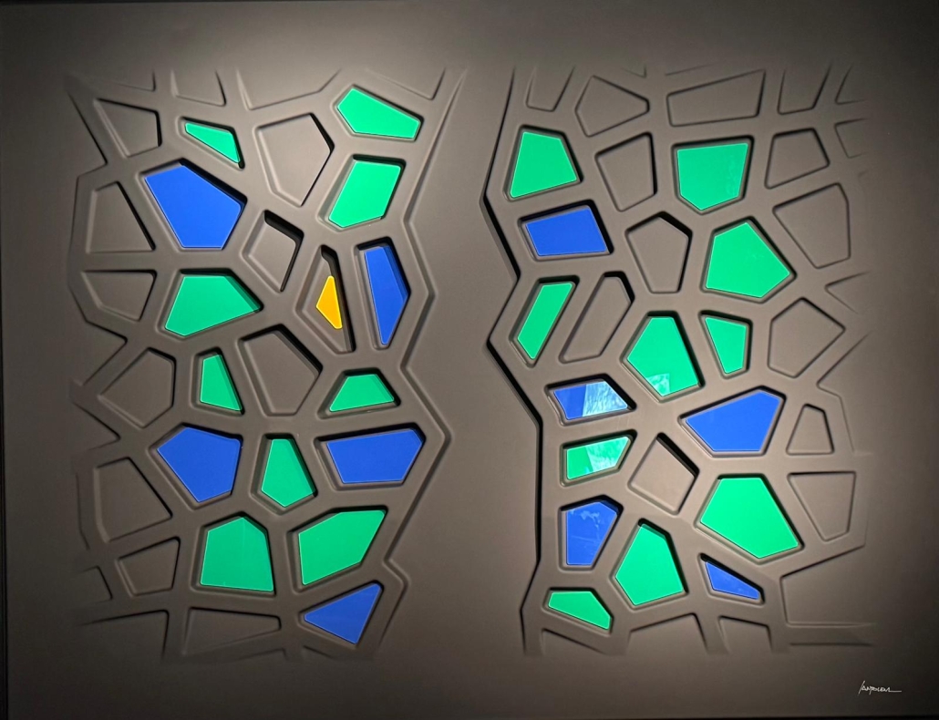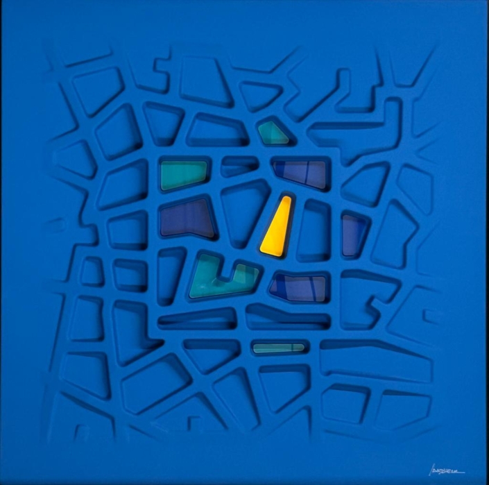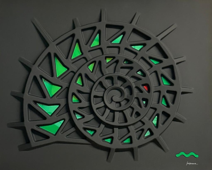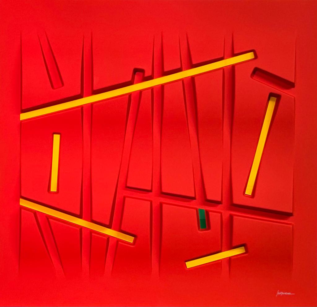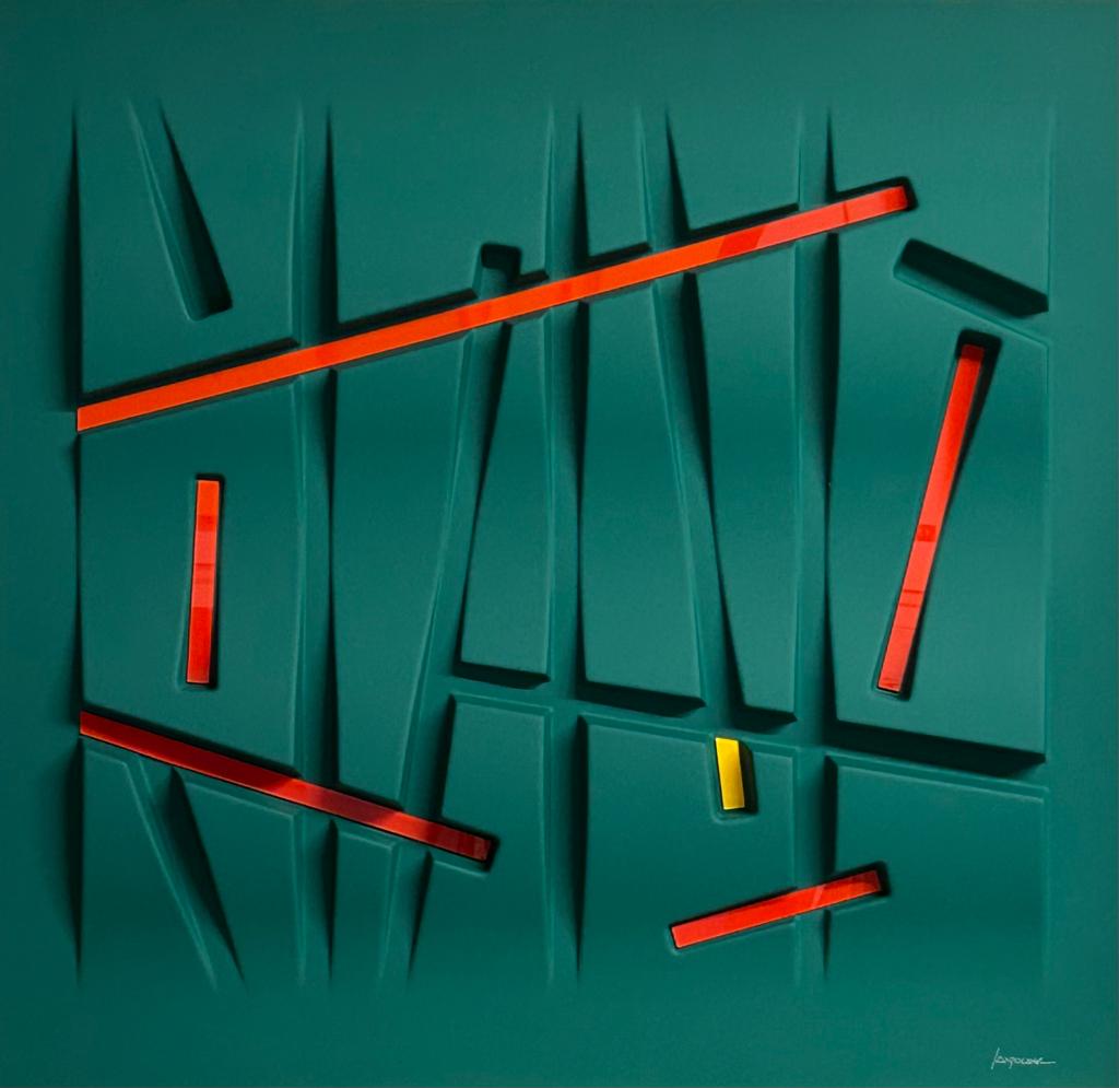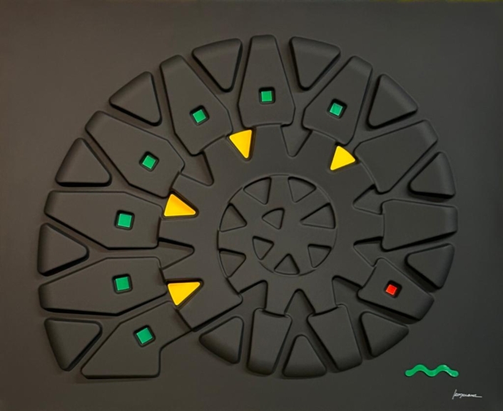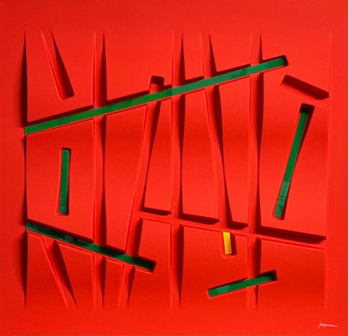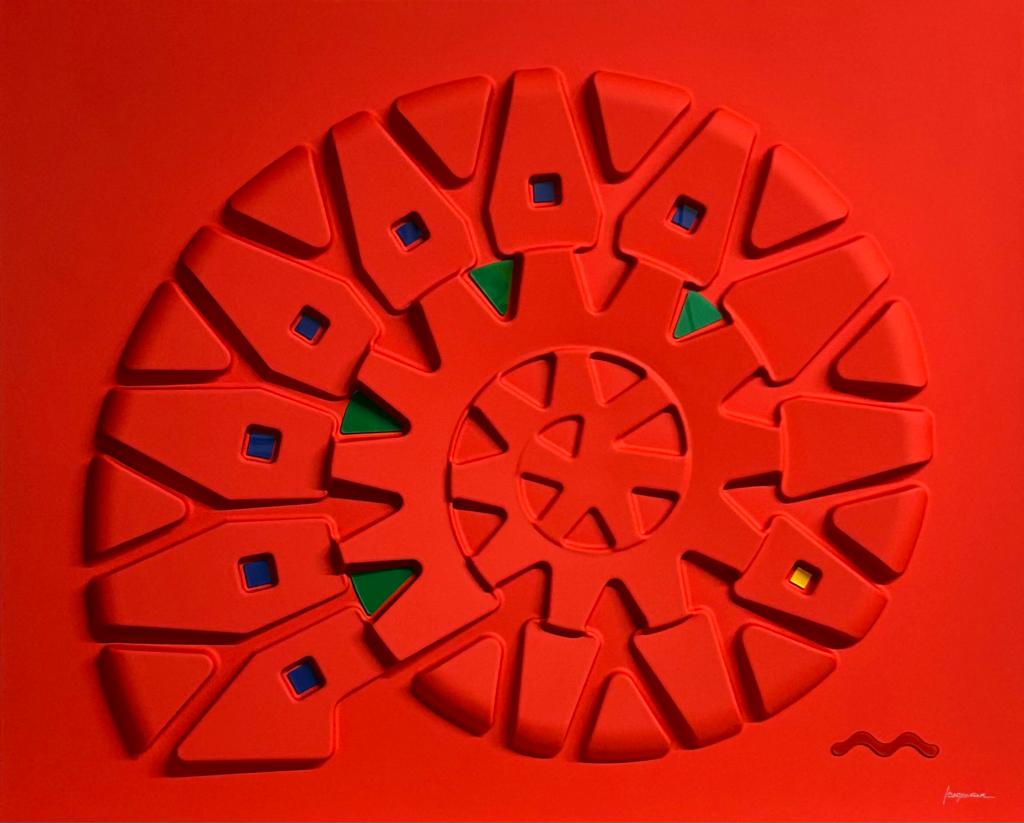 Queste opere si basano su un procedimento di termoformatura, quindi non sono tele estroflesse,ma superfici rigide, plasmate su stampi realizzati appositamente. Il colore viene dato successivamente, mediante un processo di laccatura ed essicazione in forni ventilati a 60 gradi centigradi, per oltre due ore. Gli inserti, in plexiglass opalino lucido, vengono applicati dopo la laccatura. Sono punti di colore inseriti nell’opera, seguendo un preciso schema di equilibrio cromatico. Nulla è lasciato al caso.