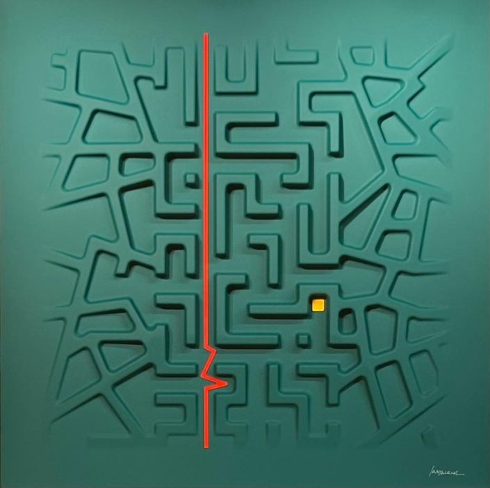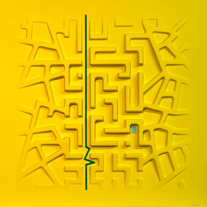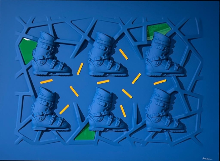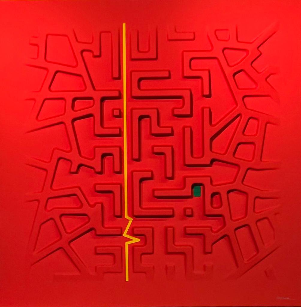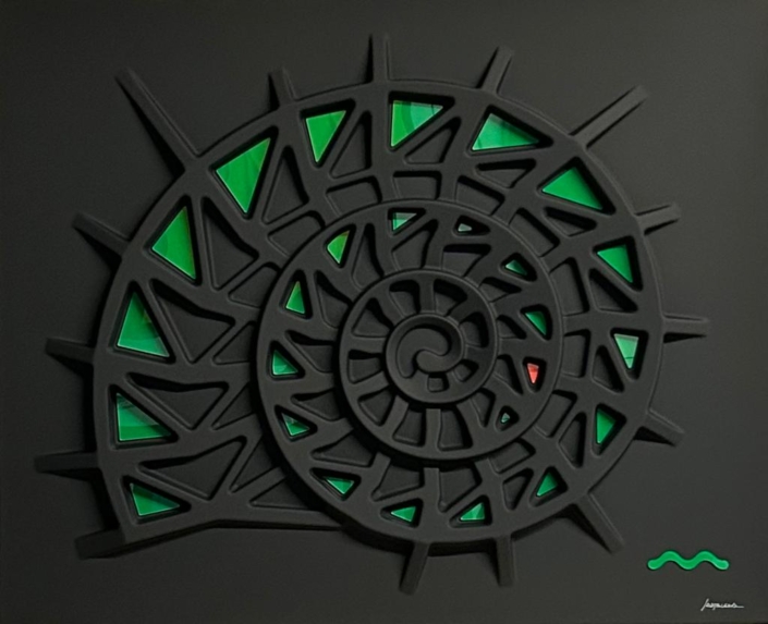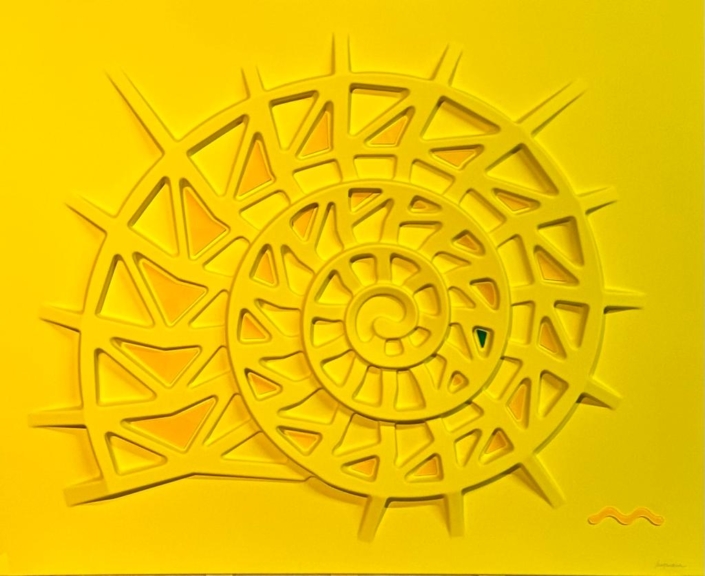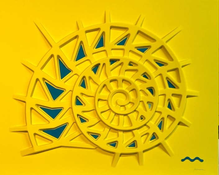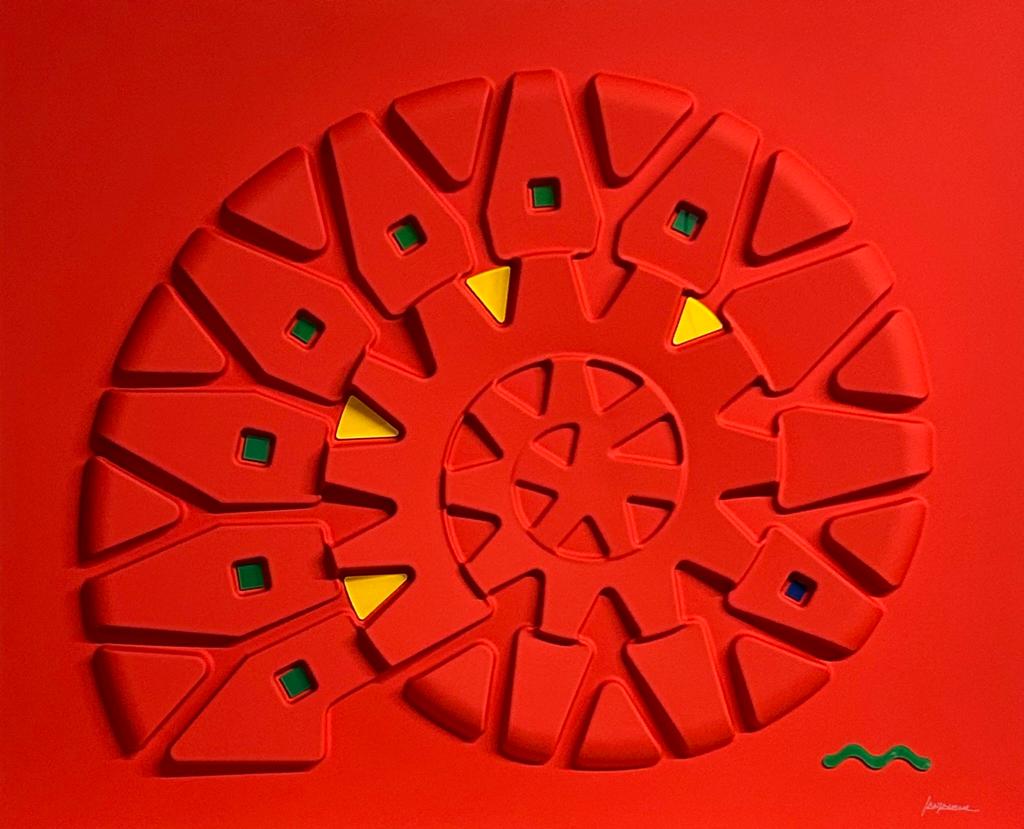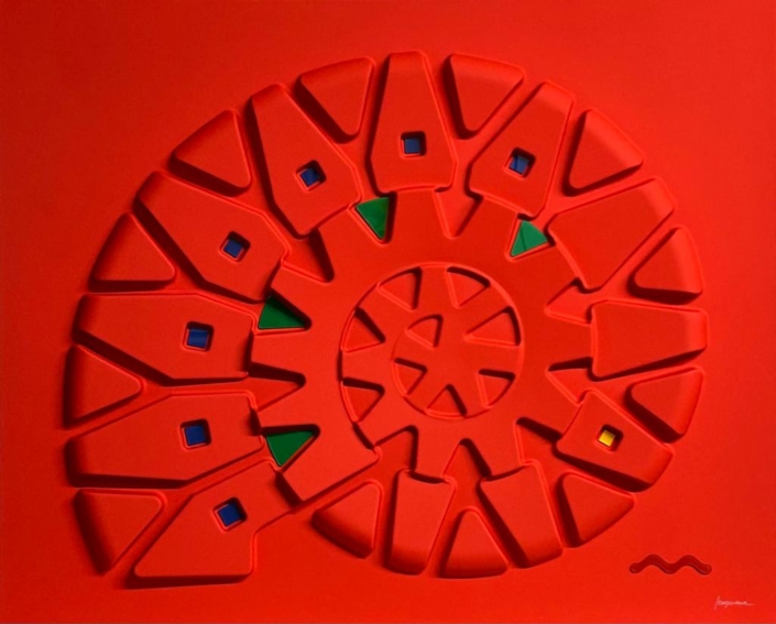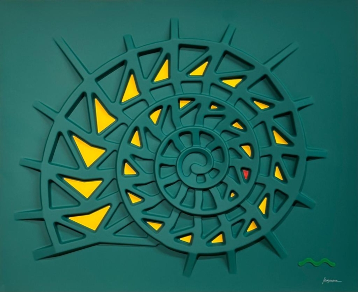 These works are based on a thermoforming process, so they are not everted canvases, but hard surfaces, shaped on molds, created for the purpose.The color is given subsequently with a system of lacquering and drying in ventilated ovens, at 60 degrees celsius, for two hours.